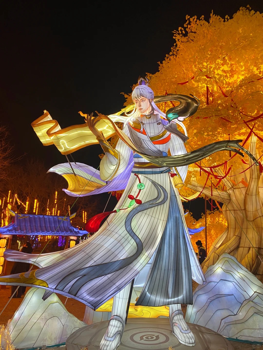 灯组由自贡彩灯非遗传承人团队领衔制作,汇聚20余名资深工匠,历时50余天完成。保留“扎、糊、剪、绘、雕”五大核心工艺,针对游戏IP特点改良:传统竹篾骨架升级为高强度钢结构,确保15米高鲁班七号灯组抗风等级达10级,适配户外展出需求。