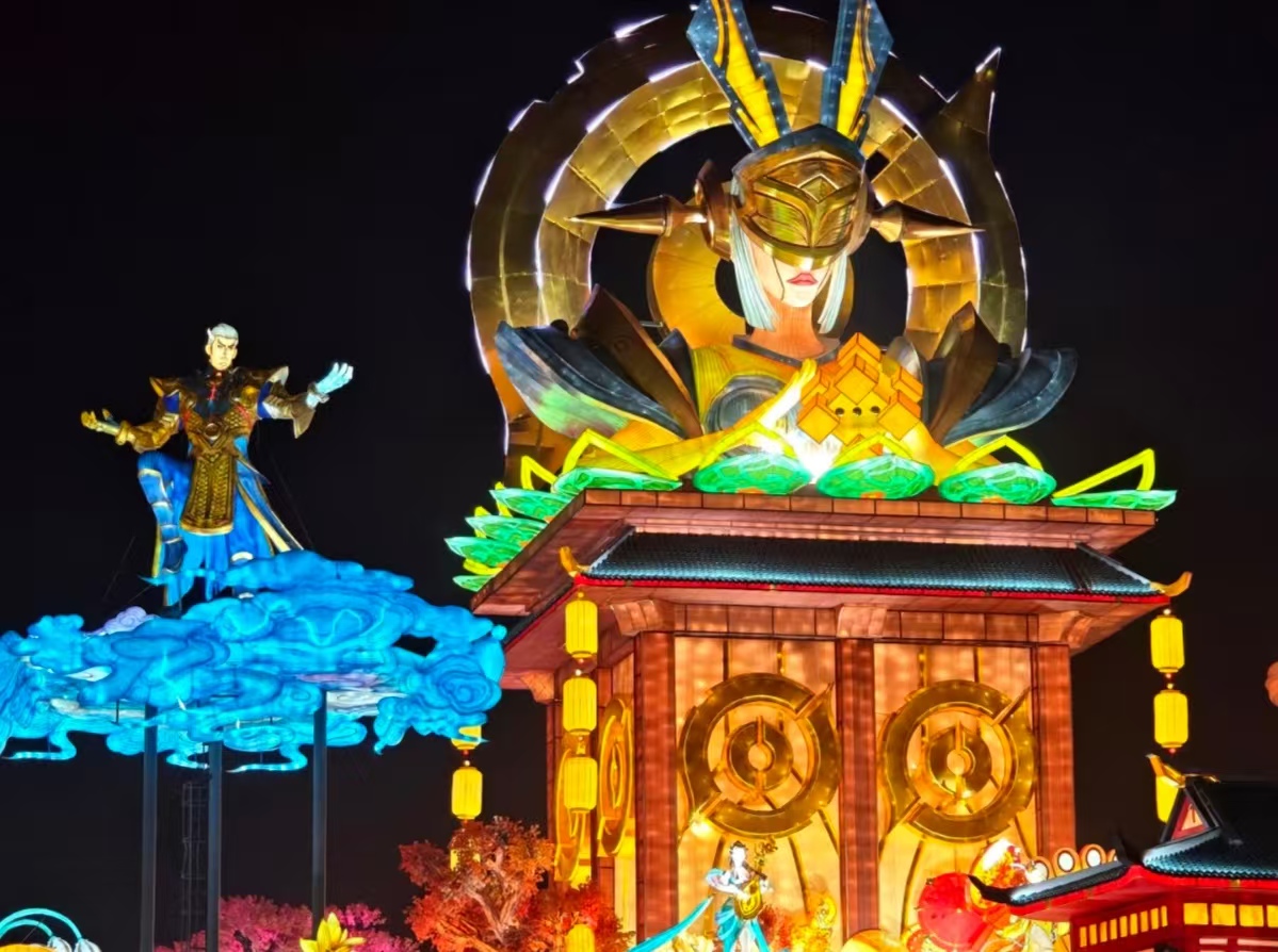 团队中的年轻匠人李娟,是张大师的第三代传人,她将现代设计理念融入传统裱糊工艺,为英雄皮肤纹理定制了专属的透光材质,既保证了色彩还原度,又保留了自贡彩灯“透、亮、柔”的传统特色。正是这种老中青三代匠人的接力传承,让千年彩灯技艺在新时代焕发出新的生命力。
