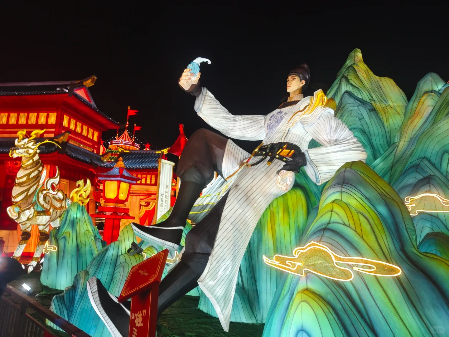 本次灯组以“数字IP赋能非遗”为核心定位,深度融合王者荣耀游戏世界观与自贡彩灯千年传统技艺,打造“不夜长安”等沉浸式主题场景,既突出春节阖家团聚的温暖氛围,又极致展现东方美学的独特韵味。灯组通过李白、杨玉环等英雄形象与灯笼、祥云、年兽等年节元素的融合设计,传递“团圆、奋进、传承”的中国文化价值观,实现传统非遗技艺与现代数字文化的共生共荣。