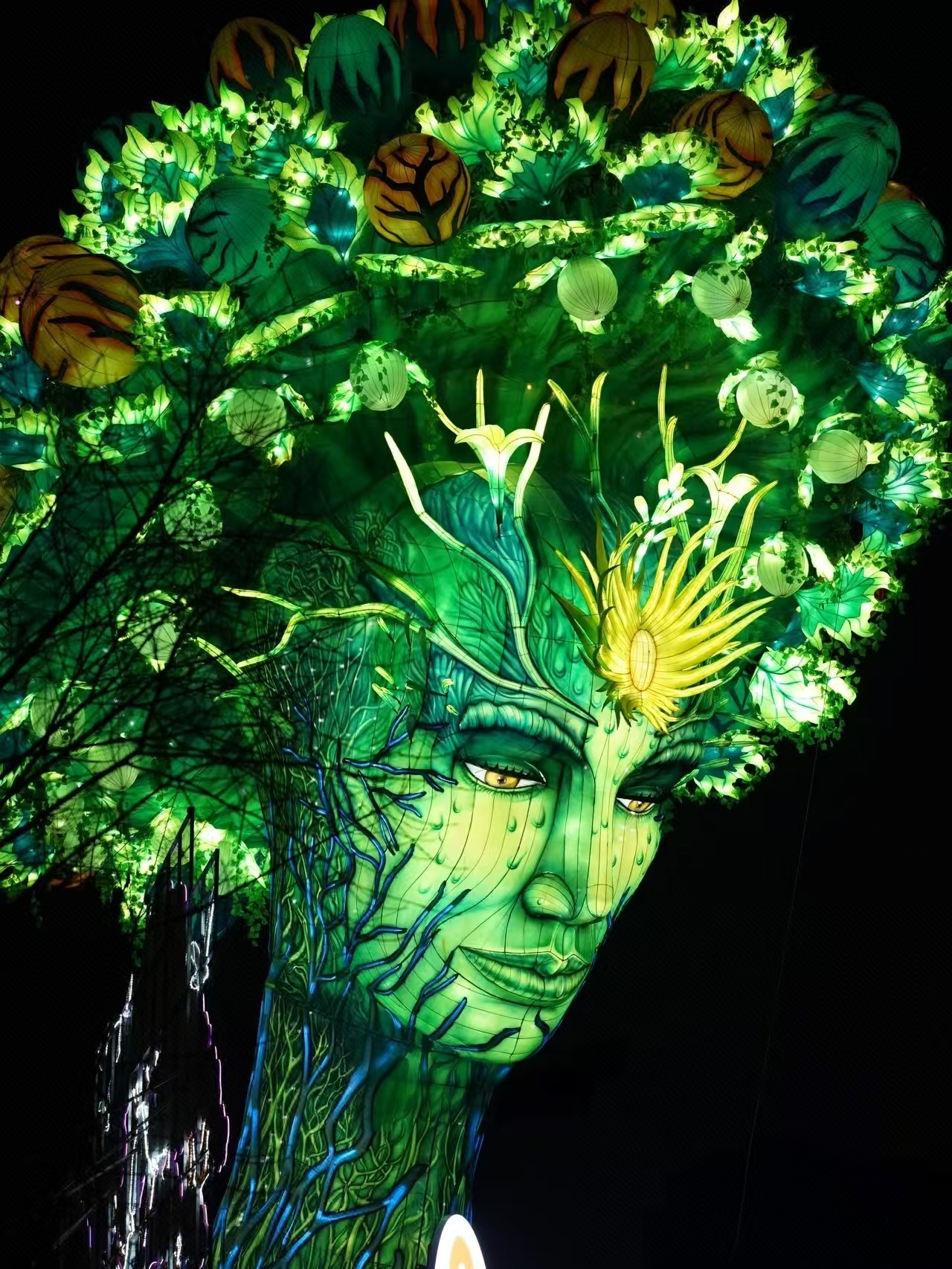 首次摒弃传统花灯以红、黄为主的暖色调体系,采用以翠绿、墨绿、青蓝为主的冷色调配色,搭配少量金色点缀,既呼应“生命”的自然属性,也打破大众对花灯“喜庆热闹”的刻板印象,开创了现代花灯的色彩新范式。